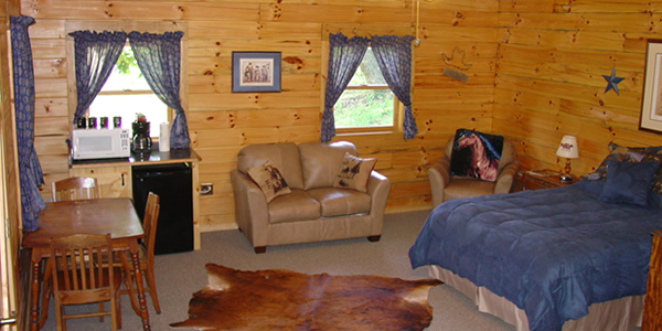 Come and stay with us for a wonderful western vacation filled with down home hospitality and good old-fashioned fun. During your visit, you can unpack your saddlebags and unroll your bedroll in one of our cozy log cabins. They are furnished in a western décor and include all of the modern conveniences such as heating and air conditioning, a mini fridge, microwave, coffee pot and all the linens and towels. The cabins vary in layout, accommodating 1-6 guests.